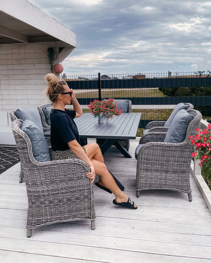 This spacious garden furniture set is a perfect fit for modern, industrial, and contemporary outdoor settings. It is made from durable yet lightweight PE rattan which is based on sturdy aluminium construction. The slatted design of the table top prevents water accumulation, while the smooth surface guarantees easy cleaning. The table easily seats up to six people and provides a stable construction for comfortable dining.