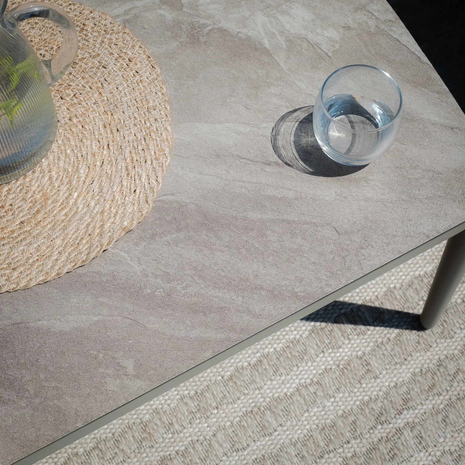 Crafted with sweeping curved frames and tapered legs, this sofa set embodies the signature look of the Milan collection. The cushions are generously thick and plush, offering exceptional comfort for lounging and relaxation. Made from shower-resistant polyester fabric, these cushions are durable and easy to maintain, ensuring your set stays looking fresh and inviting. Accompanying the sofa is a rectangular coffee table that serves as the perfect centrepiece. The table features a marble-effect ceramic glass top, combining sophistication with practicality. This durable surface is not only elegant but also easy to clean, making it ideal for outdoor use.